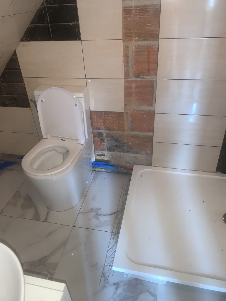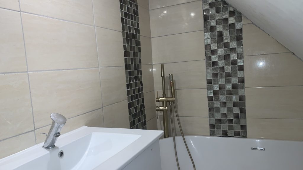 Les murs ont été habillés de carrelage adapté aux pièces humides, posé dans les règles de l’art avec joints hydrofuges.